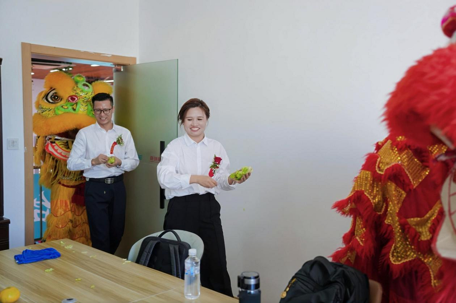 点睛礼成,祥狮觉醒!伴随激昂的鼓点,两头威武雄狮昂首腾跃,直奔店面门头的 “青阵”—— 青翠的生菜高悬其间,寓意 “生财有道、吉祥如意”。只见雄狮时而腾挪跳跃,时而俯身探爪,动作刚劲有力又不失灵动俏皮,引得现场掌声不断。最终,雄狮精准衔取生菜递向江文波先生与黄小琴女士,并将生菜洒下温州盛通好用旗舰体验中心的角角落落,象征将好运与财富洒满门店,也寓意着温州盛通好用旗舰体验中心未来生意兴隆、财源广进。