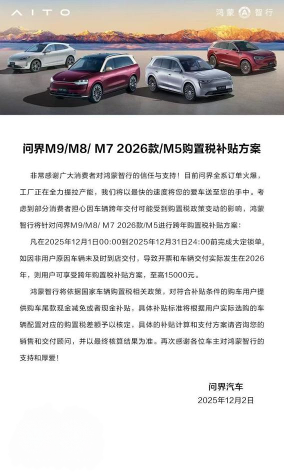 正值年末购车季,问界推出了专项购置税补贴方案:凡在2025年12月1日00:00至2025年12月31日24:00前完成大定锁单的用户,如因非用户原因导致车辆交付实际在2026年,则可享受至高15000元的购置税补贴。这项政策以切实的权益支持,助力消费者从容把握年终购车机遇,更安心地选定座驾,轻松迈向智慧出行新阶段。